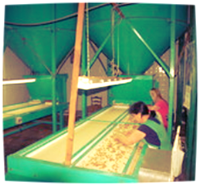 La almendra sin piel pasa a un secadero donde con ayuda de un aspirador a temperatura elevada (80-90º) se le quita la humedad a la pepita.